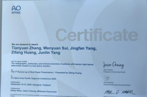 2025年9月18日至21日,由国际权威脊柱外科学术组织AO Spine主办的2025年度亚太区脊柱大会在泰国曼谷举行。国内知名脊柱畸形专家杨军林教授团队获邀,由成员黄紫房教授、张天元博士代表团队参加此次盛会。